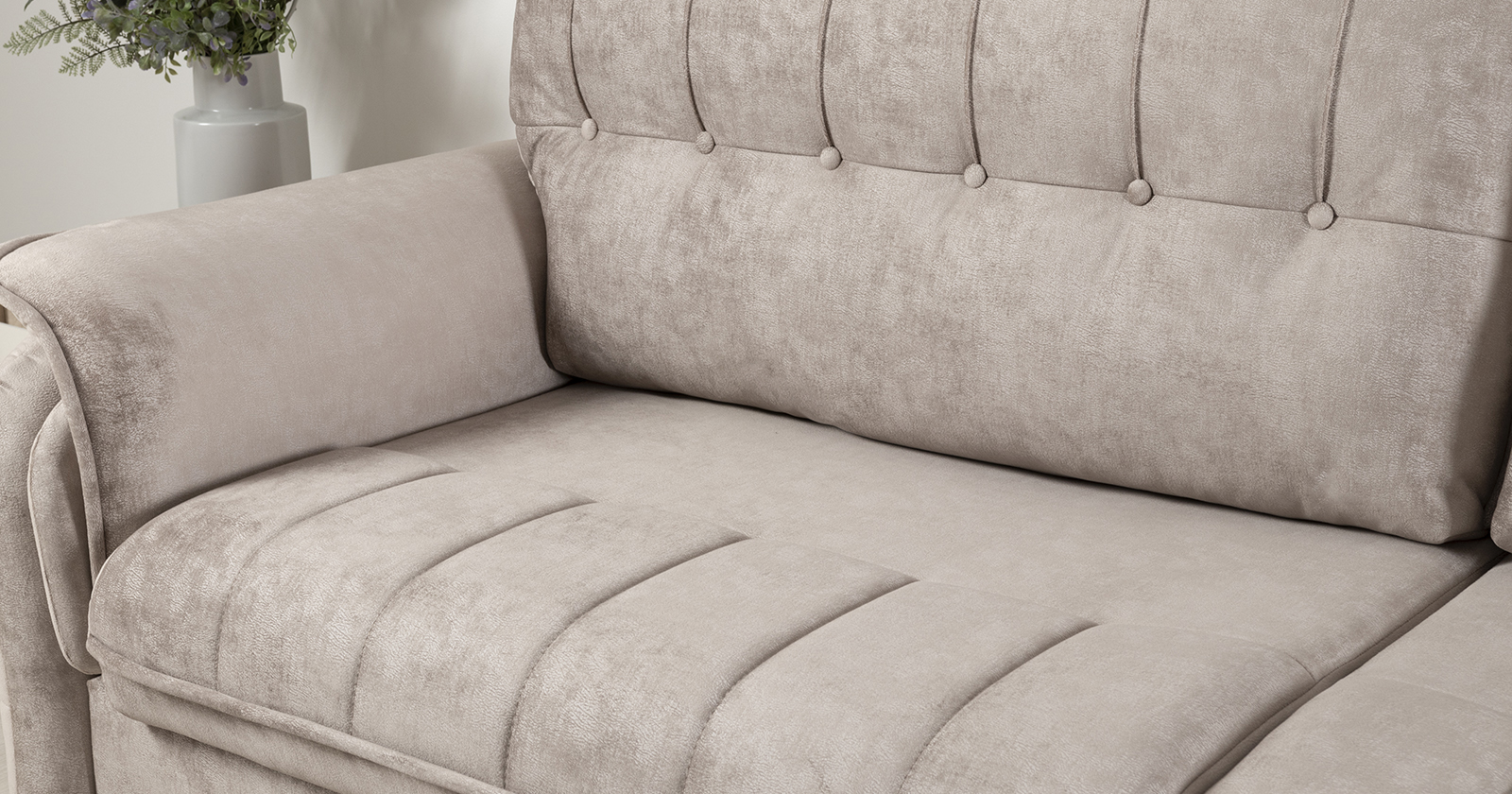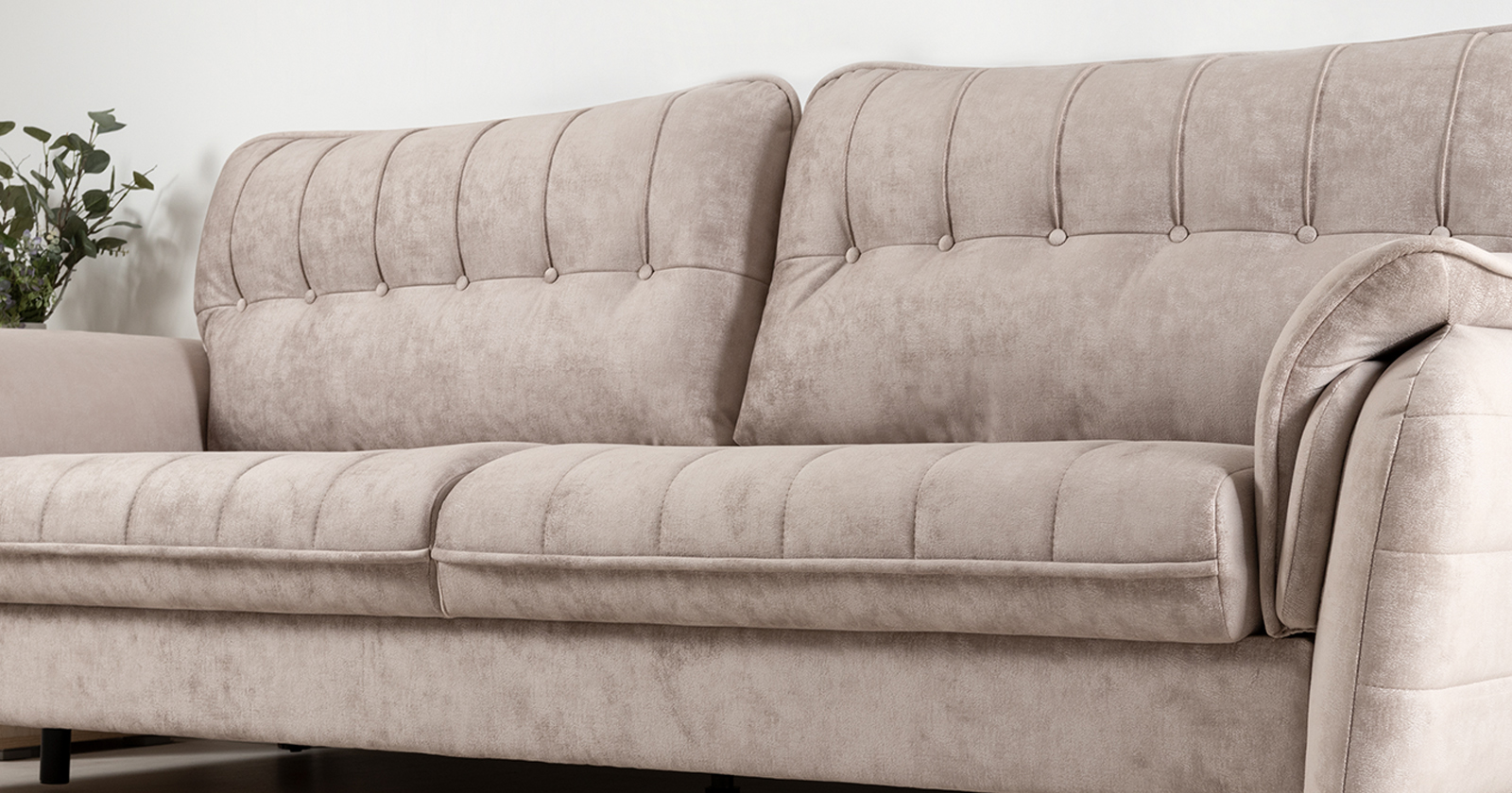 Декоративные канты на подушках дивана, подлокотниках и сиденье. Стежка на передней части сиденья и внешней части подлокотника. Защипы на верхней части подушки. Втяжки с пуговицами на приспинных подушках.