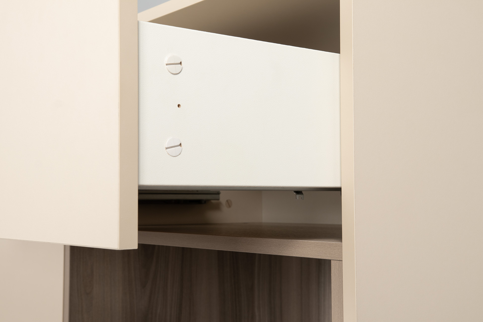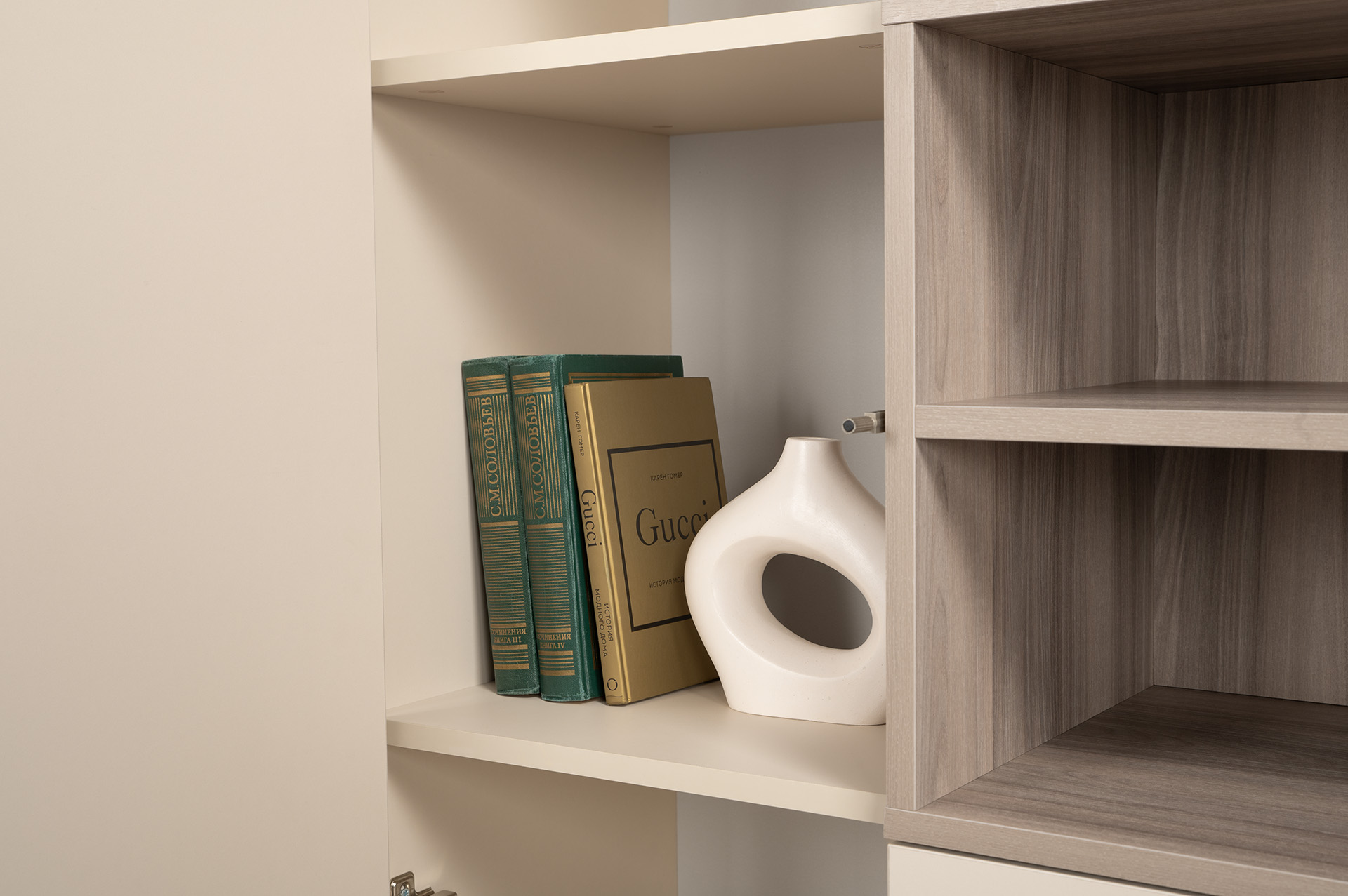 Благодаря нейтральному светлому оттенку и универсальности декора модули можно разместить в спальне, гостиной, прихожей.