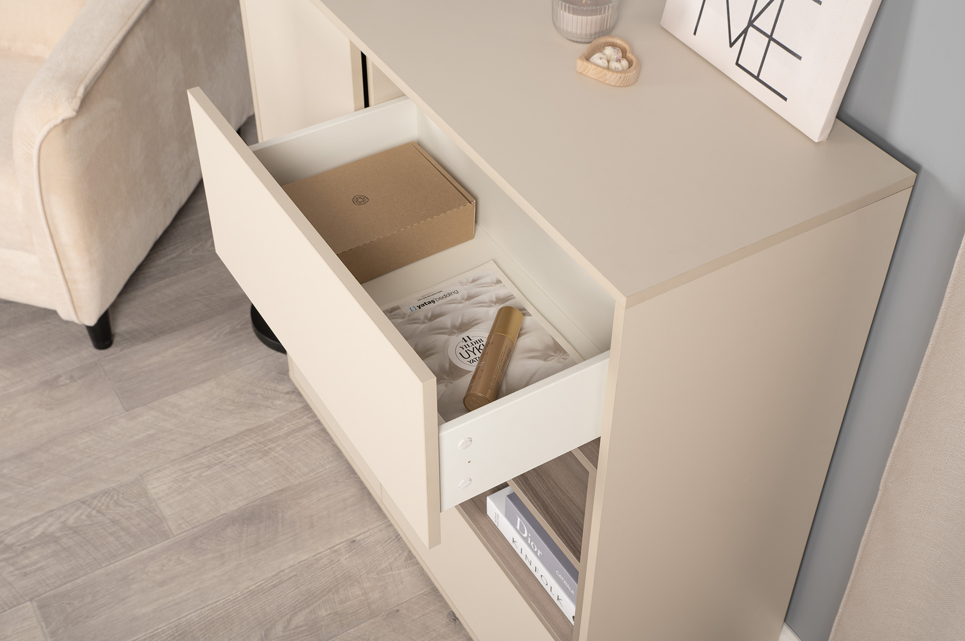Комод Тайл 16.236 сатин 7045 SU, эмили блаш U9135, белый PE шагрень, собирается на любую сторону