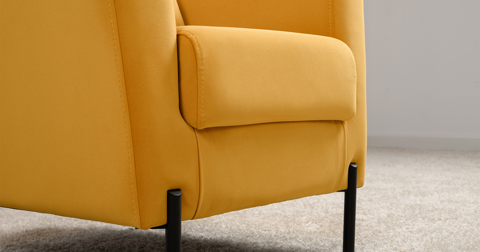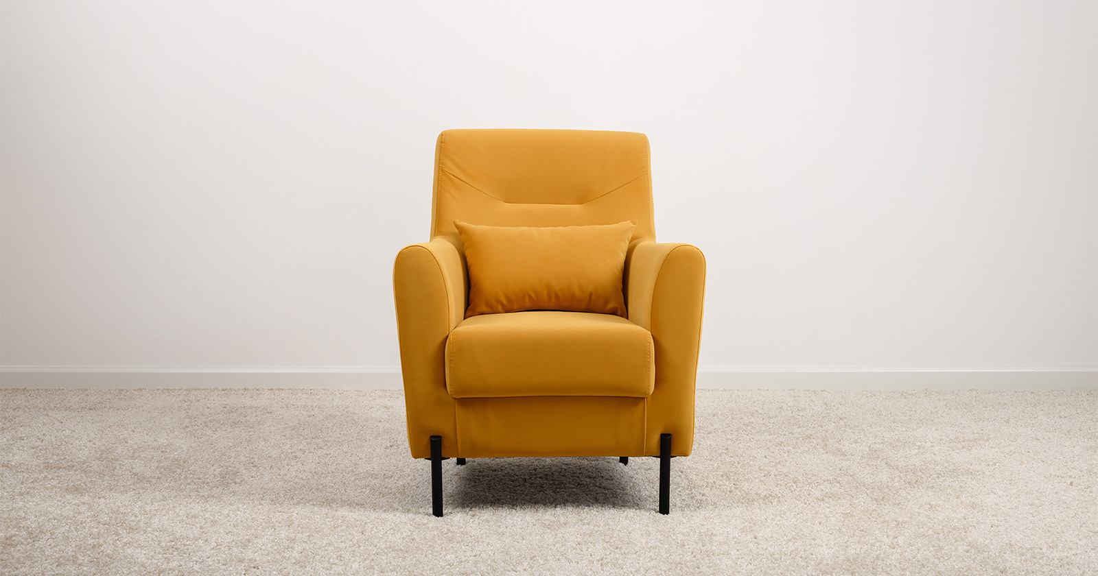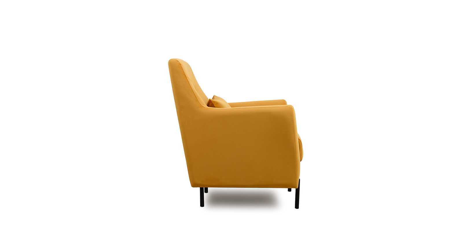 Декоративная утяжка на спинке кресла, декоративная подушка в цвете кресла, металлические опоры переходят в декоративный элемент подлокотника