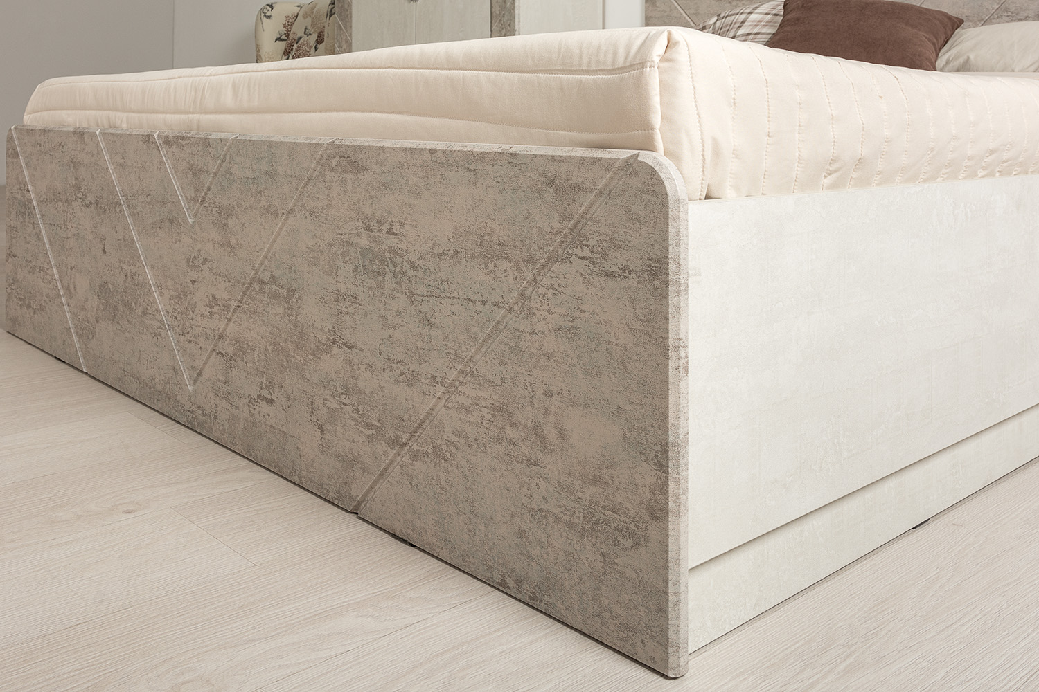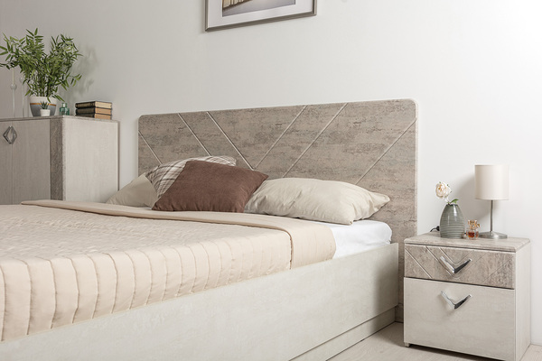 Мягкое изголовье и изножье кровати выполнено из ЭКОкожи, что гарантирует комфорт при эксплуатации и легкость в уходе. Декоративная прострочка повторяет общий мотив всей коллекции.