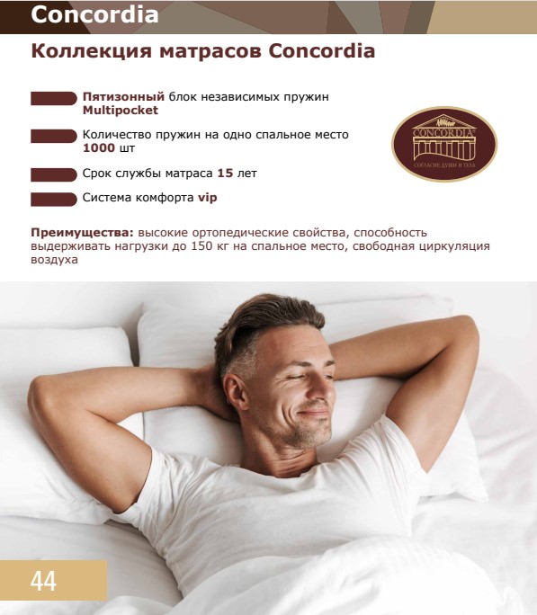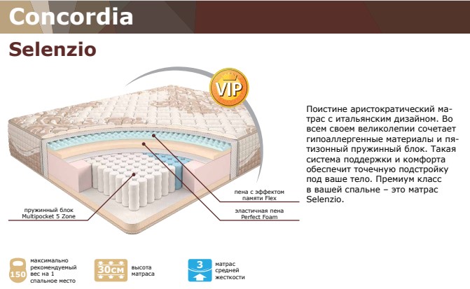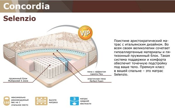 Поистине аристократический матрас с итальянским дизайном. Во всем своем великолепии сочетает гипоаллергенные материалы и пятизонный пружинный блок. Такая система поддержки и комфорта обеспечит точеченую подстройку под ваше тело. Премиум класс в вашей спальне - это матрас Selenzio. Матрас объединяет в себе все лучшие свойства материалов, специально созданных для достижения максимального комфорта и уюта. Надежная внутренняя конструкция матраса обеспечивает отличную поддержку позвоночника. А высокоэластичная суперпена с эффектом памяти создает непревзойденное ощущение невесомости и легкости. Особенную прохладу, свежесть и мягкость придает матрасу Concordia Celenzio чехол, выполненный из трикотажа с волокнами вискозы и пропитанный ионами серебра. Погружаясь в сказочный волшебный сон, Вы будете чувствовать лишь нежность, легкость и беззаботность.
