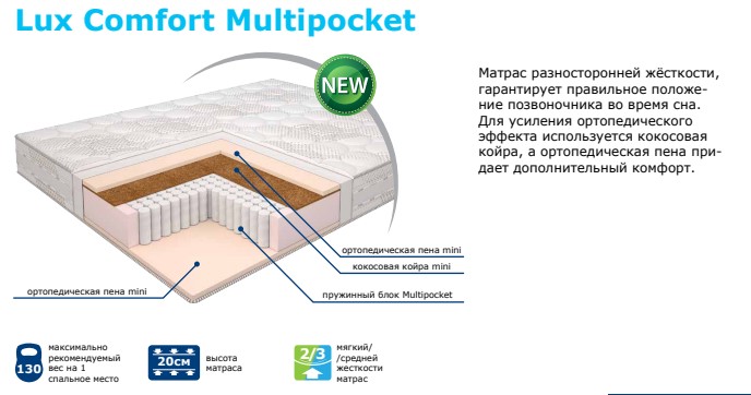 Матрас разносторонней жёсткости, гарантирует правильное положение позвоночника во время сна. Для усиления ортопедического эффекта используется кокосовая койра, а ортопедическая пена придает дополнительный комфорт.