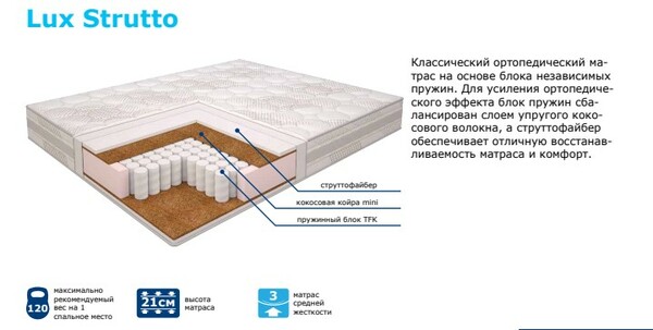 Идеальное сочетание долговечного упругого и прочного кокосового волокна с мягким струттофайбером делают данный матрас комфортным и надежным в эксплуатации.