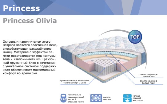 Матрас объединяет в себе все лучшие свойства материалов, специально созданных для достижения максимального комфорта и уюта. Надежная внутренняя конструкция матраса обеспечивает отличную поддержку позвоночника. А высокоэластичная суперпена с эффектом памяти создает непревзойденное ощущение невесомости и легкости. Особенную прохладу, свежесть и мягкость придает матрасу Princess Olivia чехол, выполненный из трикотажа с волокнами вискозы и пропитанный ионами серебра. Погружаясь в сказочный волшебный сон, Вы будете чувствовать лишь нежность, легкость и беззаботность.
