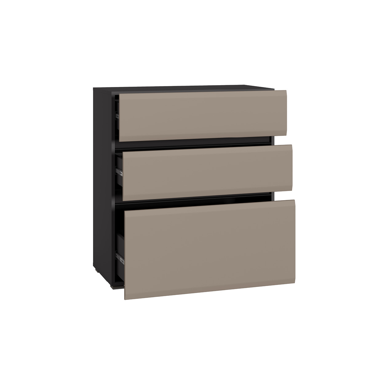 Минималистичные фасады в трендовом цвете без лицевой фурнитуры открываются за край либо нажатием (push-to-open).
