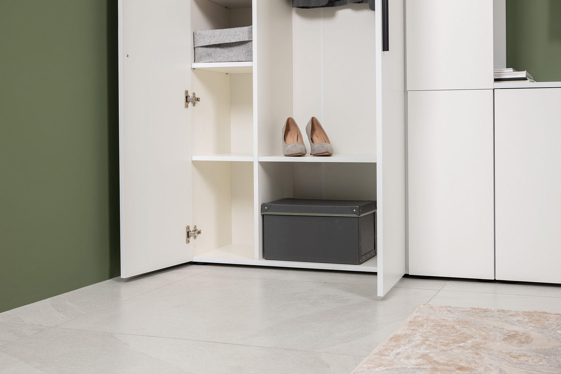 Модули универсальны и сочетаются между собой. Открытые и закрытые ниши для хранения, защитные пластиковые демпферы, съемные полки, направляющие полного выдвижения в ящиках – комфорт продуман до мелочей.