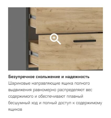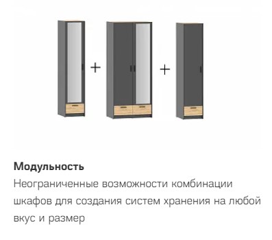 Шкаф оснащен двумя выдвижными ящиками для вещей, которые плавно и бесшумно скользят за счет шариковых направляющих, а также овальной штангой для хранения одежды на вешалках. Шкаф можно дополнить другими модульными шкафами из одноименной коллекции.
