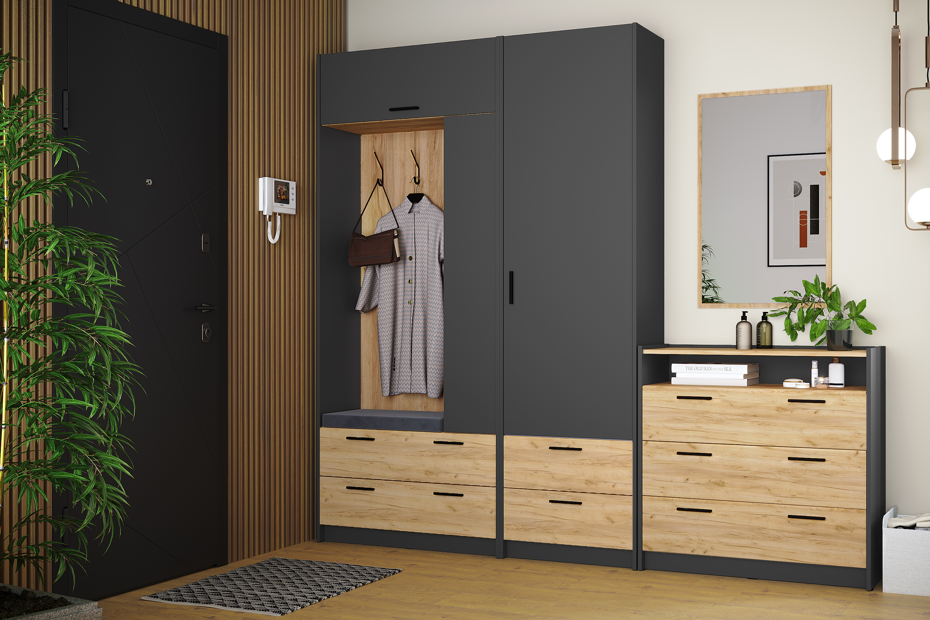 Шкаф для одежды из новой коллекции Оттавия представлен в двух цветах на выбор – белый и антрацит. Шкаф отлично подойдет в прихожую или гостиную для любого современного интерьера, как скандинавского, так и урбанистического.