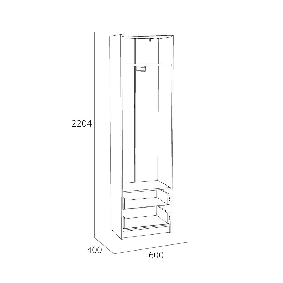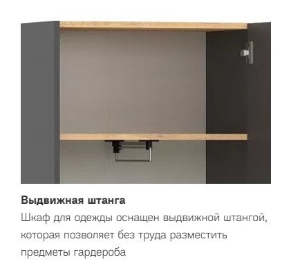 Шкаф оснащен полкой для хранения вещей, двумя выдвижными ящиками с шариковыми направляющими, за счет которых они выдвигаются плавно и бесшумно, а также выдвижной штангой, которая позволяет комфортно размещать предметы гардероба. Шкаф является модульным, что позволяет комбинировать его с другими шкафами и тумбами из одноименной коллекции. Лаконичный дизайн шкафа гармонично подчеркивается черными ручками.