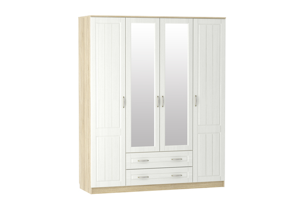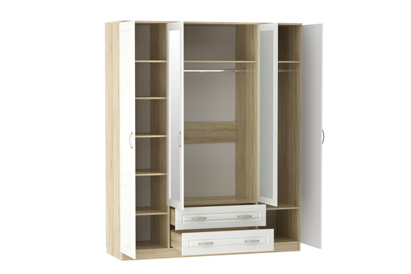 Вместительный шкаф Оливия НМ 011.84 Х поможет организовать место хранения вещей всей семьи. Шкаф имеет две секции со штангами, что позволяет рассортировать вещи по необходимым характеристикам: взрослая и детская; зимняя и летняя и т.д. Отдел с полками оптимален для размещения повседневной одежды, а два выдвижных ящика помогут раздельно хранить белье и аксессуары. Две центральных дверцы декорированы зеркалами, которые визуально увеличивают пространство комнаты и делают процесс сборов максимально удобным.