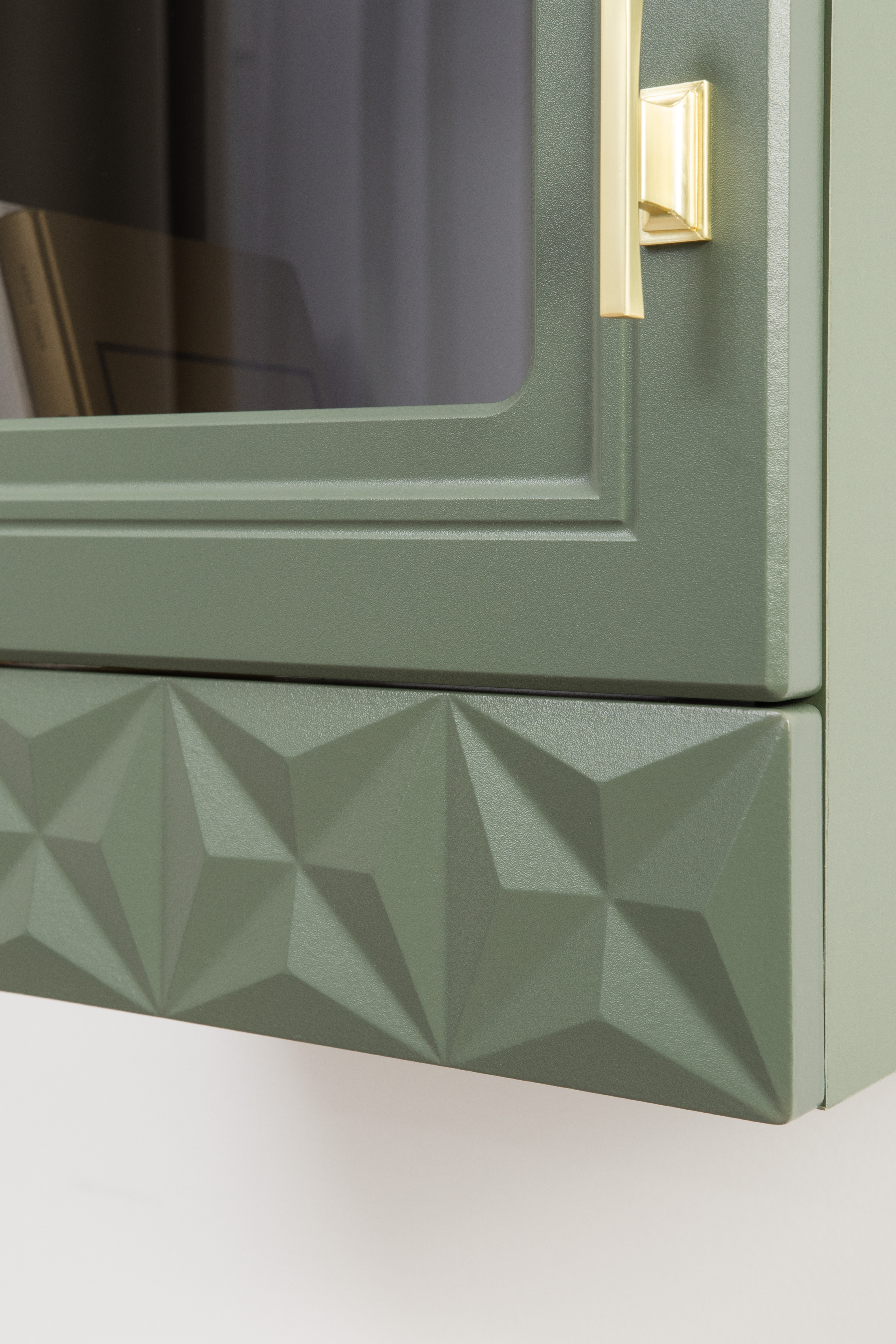 Изящные линии, глубокая фрезеровка фасадов из МДФ и благородные оттенки. Утончённая «Слоновая кость» и изысканная «Олива Шагрень» с глубоким зелёным тоном — создают атмосферу уюта, тепла и благородства. Металлические ручки и опоры золотого цвета придают мебели утончённый блеск, а петли и направляющие с доводчиками обеспечивают плавное и бесшумное закрытие фасадов.