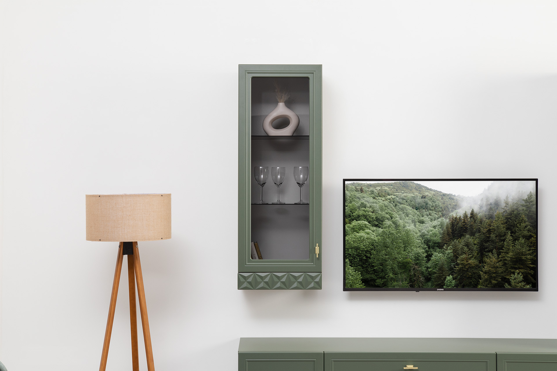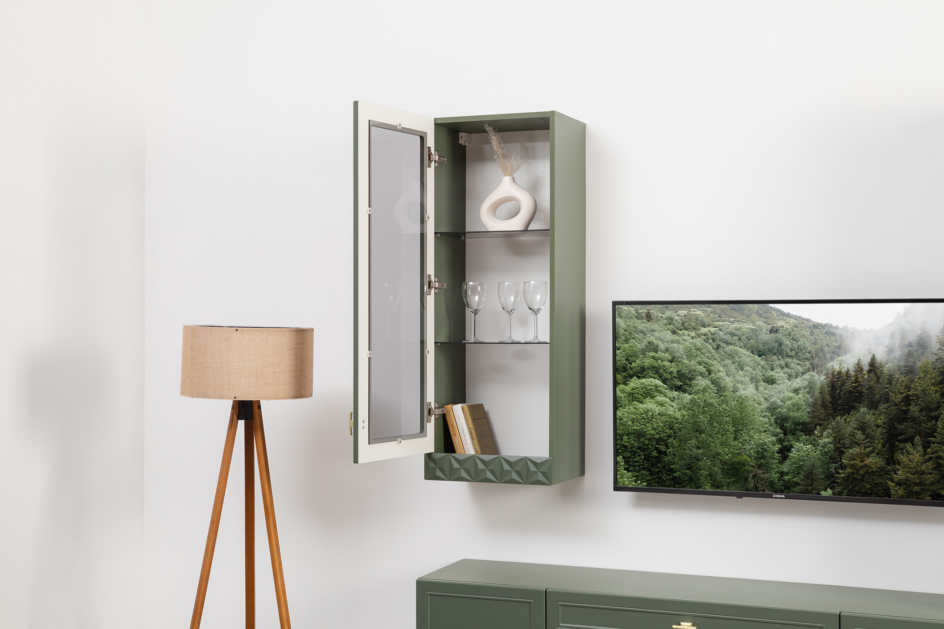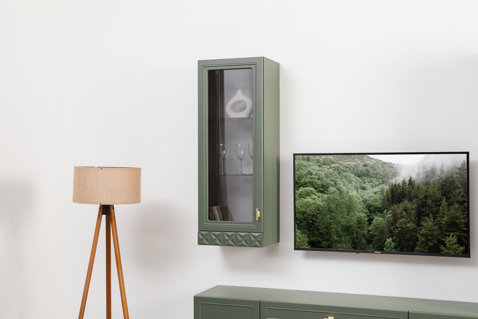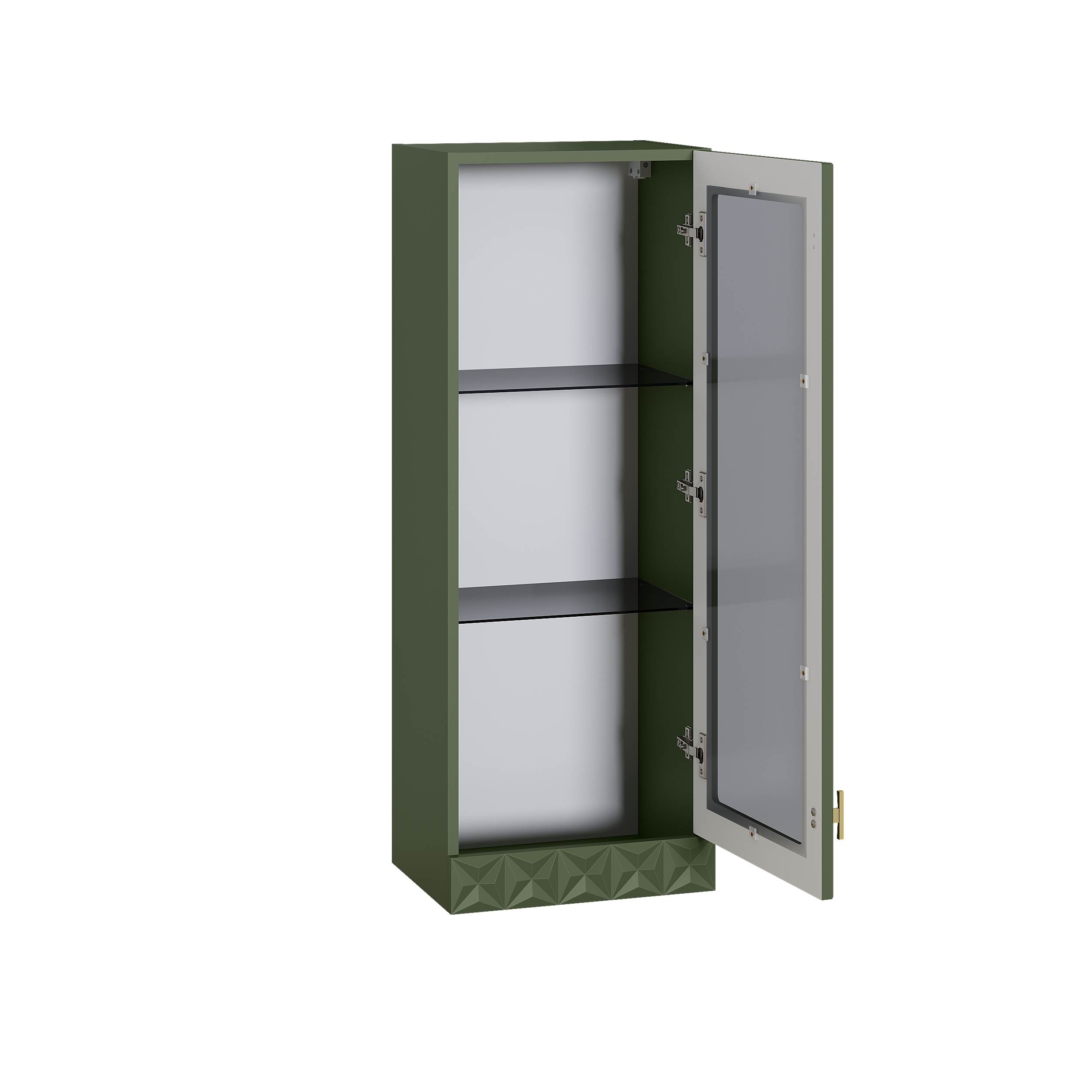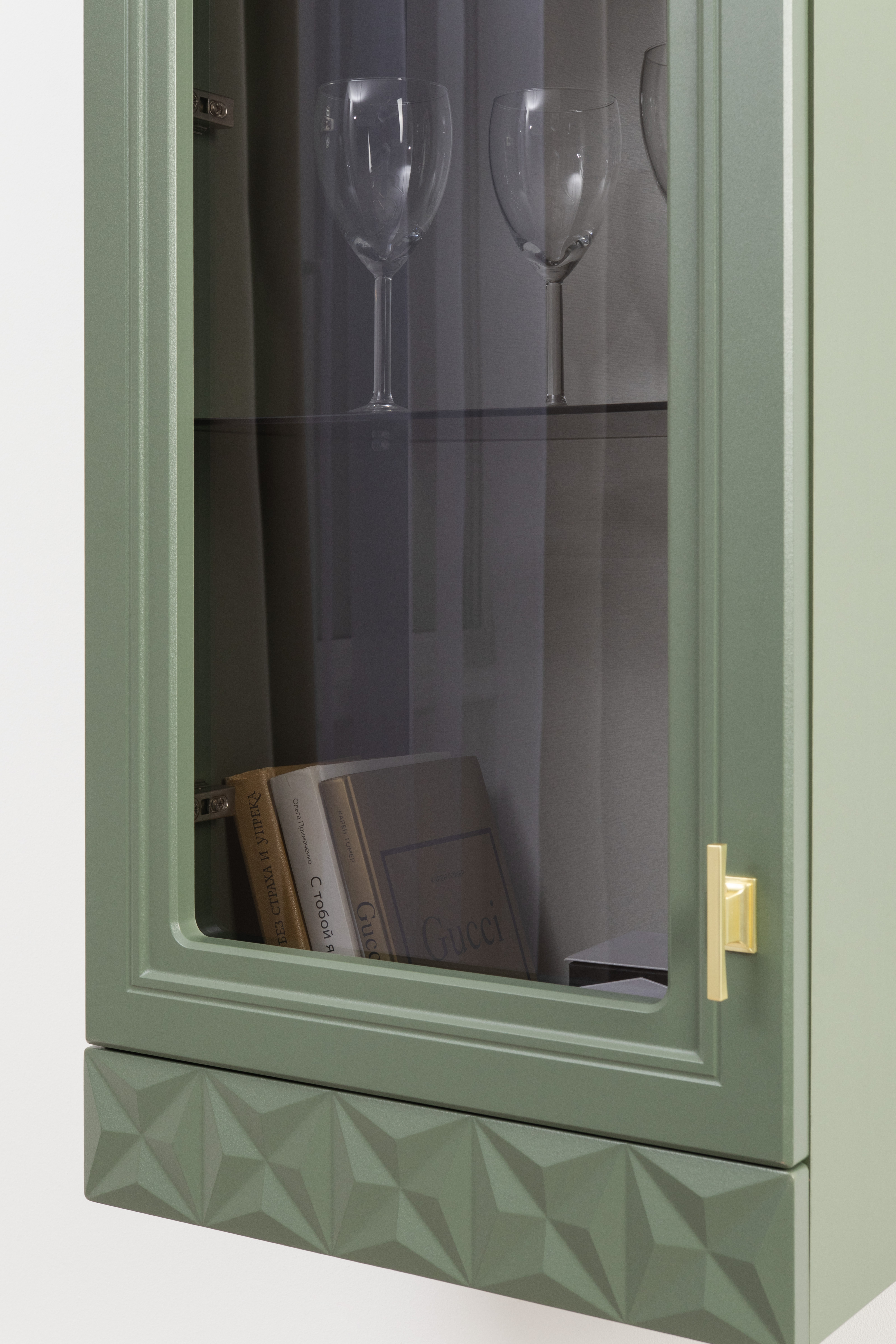 Шкаф навесной Марион 16.334 дымчатый зеленый K521, олива шагрень AG 1050 ПВХ (собирается на любую сторону)