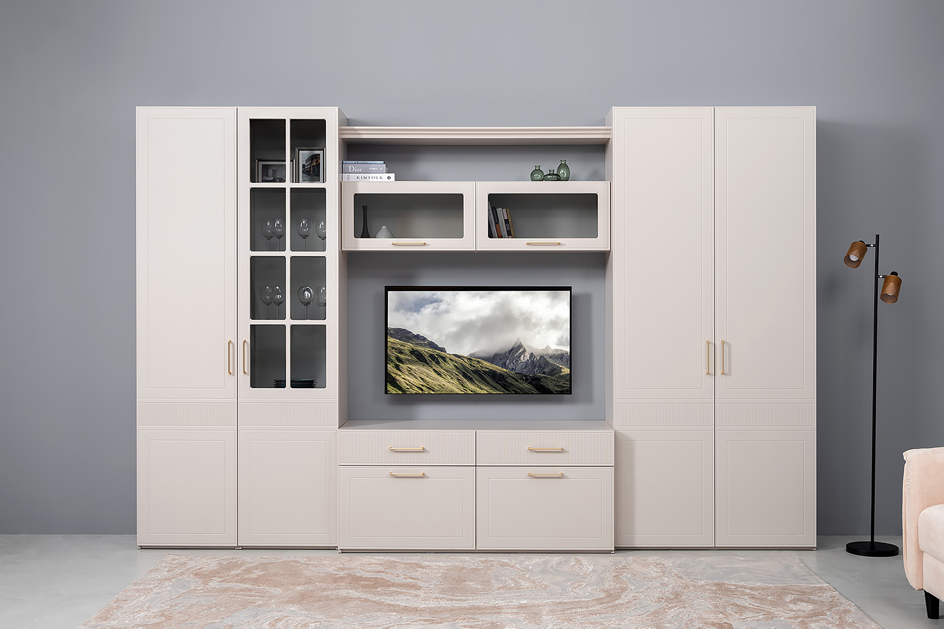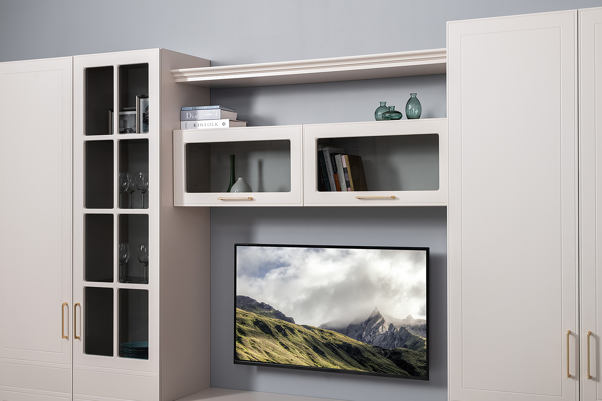 Фрезерованные фасады из МДФ, металлические ручки и витрины с тонированным стеклом создают изысканный образ.