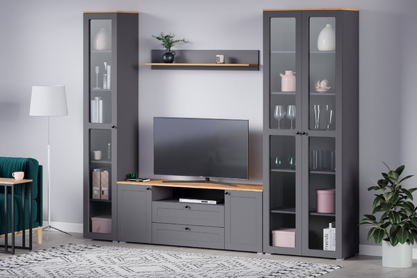 Шкаф-витрина в гостиную Остин 16.394.03 серый графит 0162 РЕ, дуб золотой CRAFT, графит ZB 856-2 ПВХ