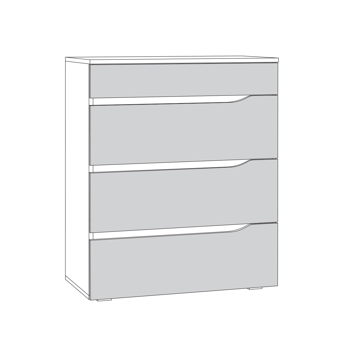 Наполнение шкафа может собрано на любую сторону, два выдвижных ящика скрыты за распашными фасадами, на обратной стороне которых размещается зеркало.
