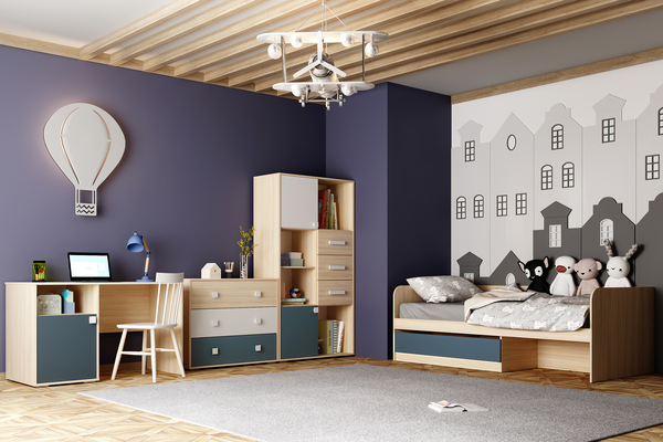 Стеллаж из новой коллекции детской мебели Элиот выполнен в нейтральных оттенках песочного, белого и контрастного маренго – цвета темной морской волны, что позволяет вписать стеллаж в интерьер спальни как девочки, так и мальчика, придав комнате современный и стильный вид.