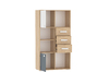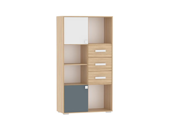 Стеллаж оснащен двумя полками с распашными дверками и тремя выдвижными ящиками, а открытые системы хранения позволяют расставить на видных местах сувениры, книги и украсить комнату так, как нравится ребенку. Для выдвижения ящиков используются шариковые направляющие, которые равномерно распределяют вес содержимого и обеспечивают плавный бесшумный ход ящика. Двери могут крепиться как на левую, так и на правую стенки.