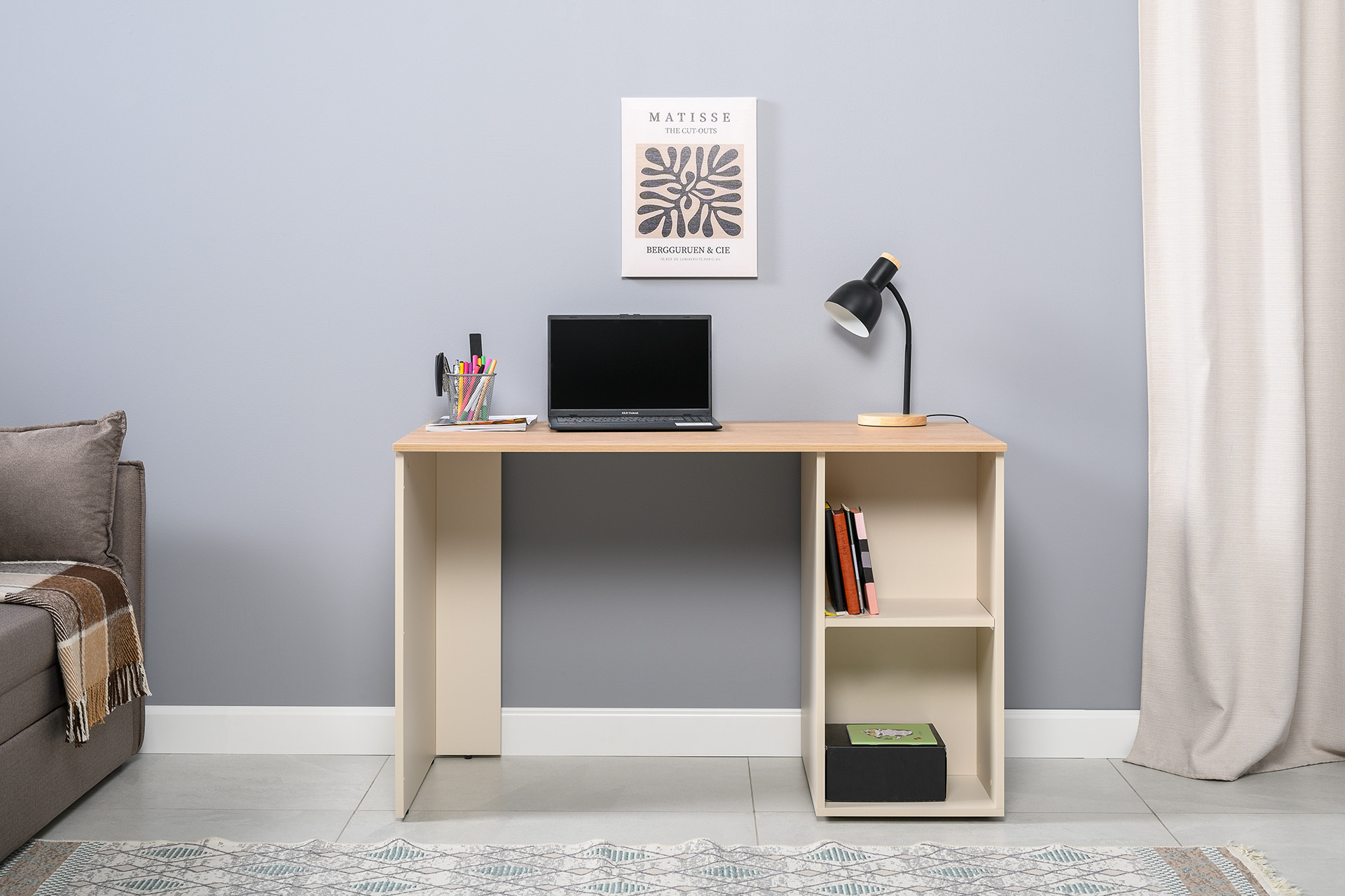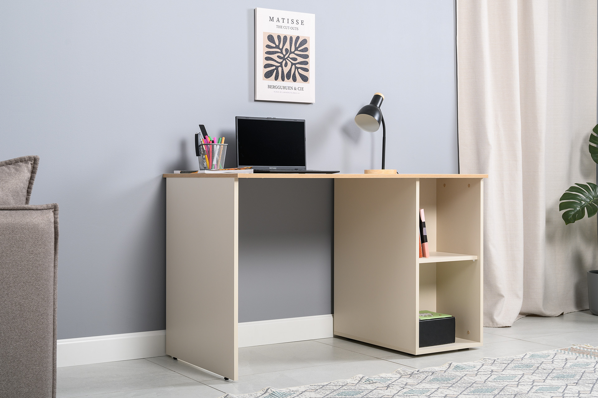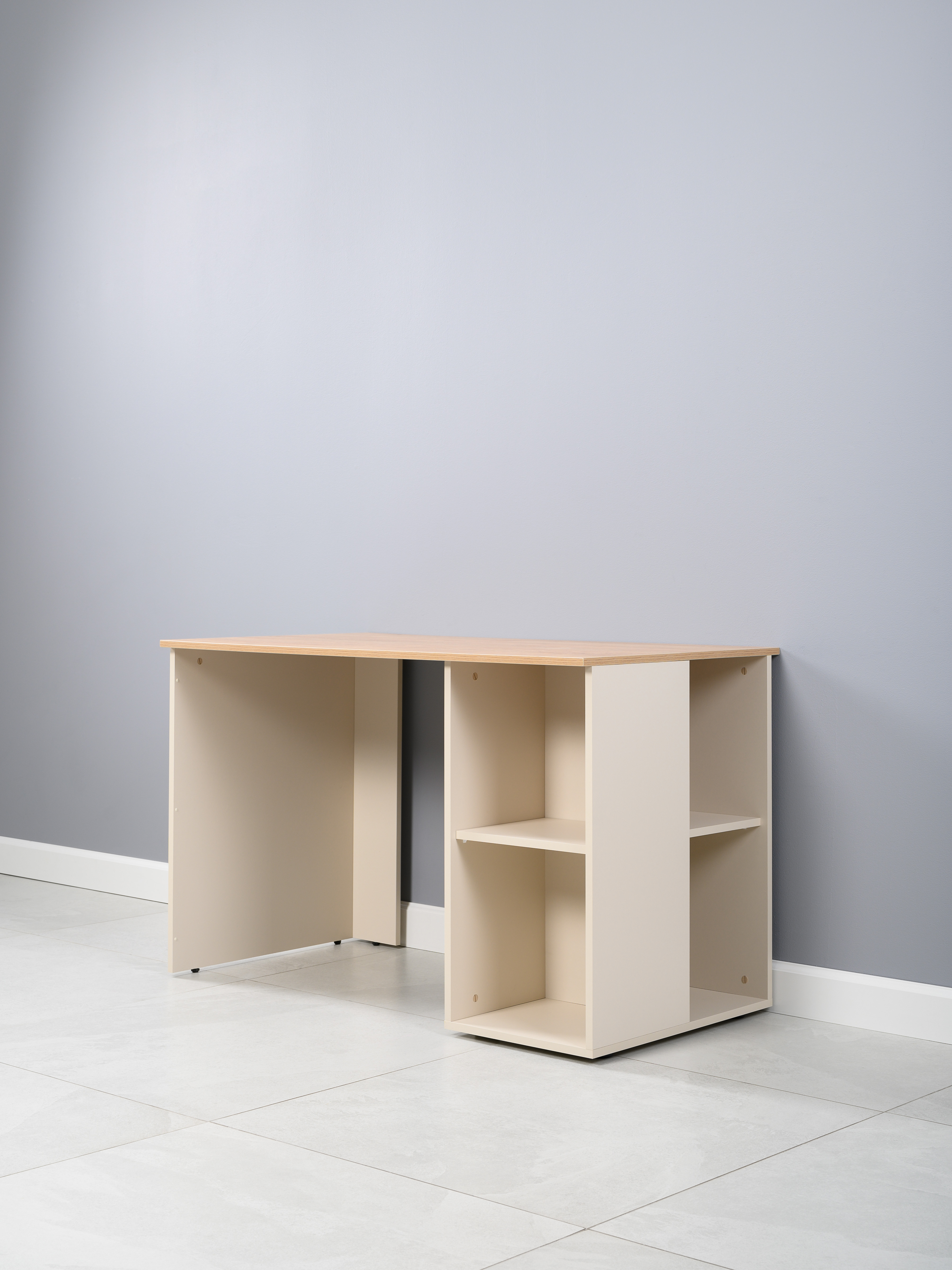 Стол письменный Лайт 12.163 сатин 7045 SU, гикори рокфорд натуральный KO86 PW, сборка на любую сторону, два варианта сборки тумбы