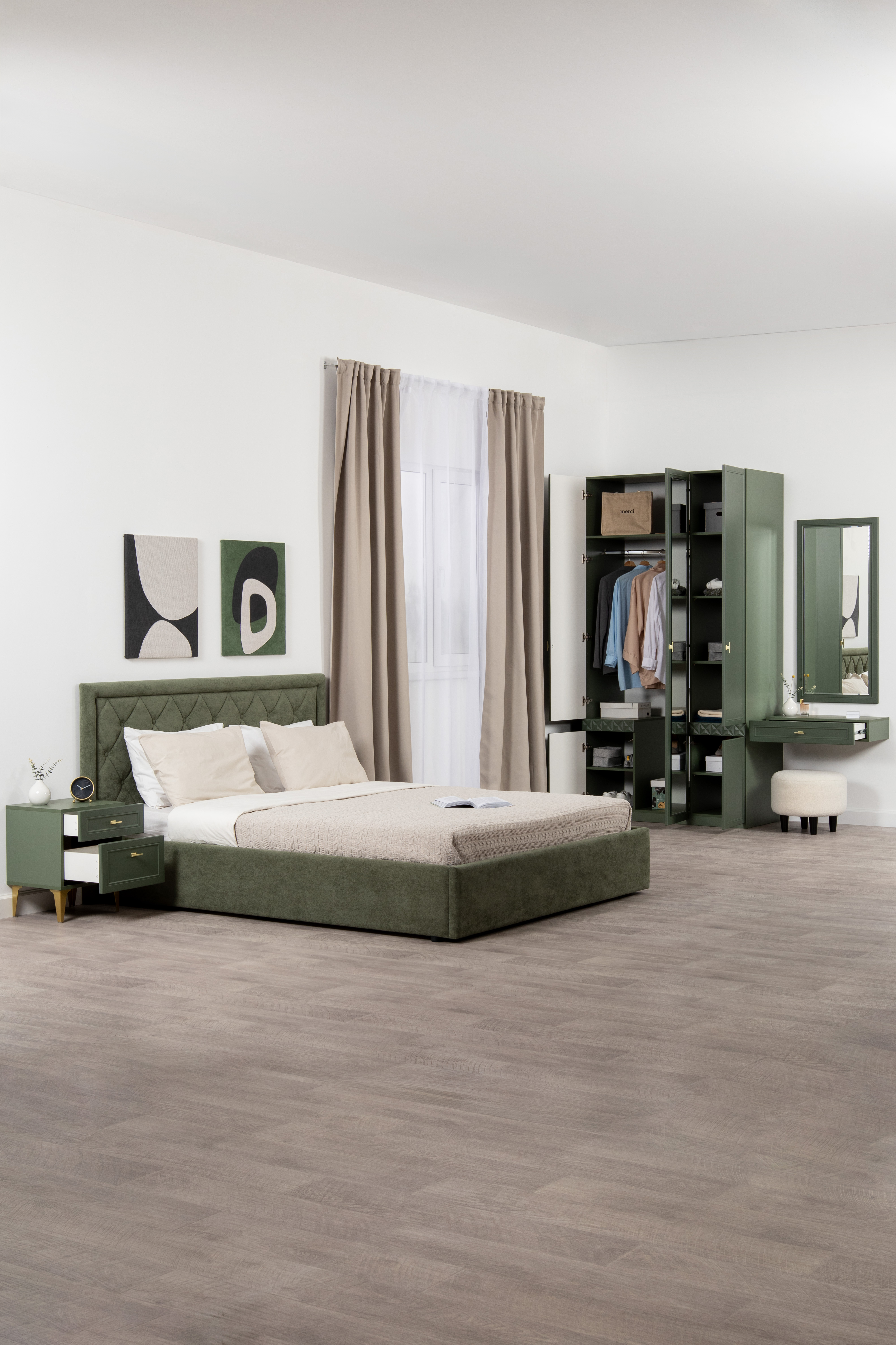 Изящные линии, глубокая фрезеровка фасадов из МДФ и благородные оттенки. Утончённая «Слоновая кость» и изысканная «Олива Шагрень» с глубоким зелёным тоном — создают атмосферу уюта, тепла и благородства. Металлические ручки и опоры золотого цвета придают мебели утончённый блеск, а петли и направляющие с доводчиками обеспечивают плавное и бесшумное закрытие фасадов.